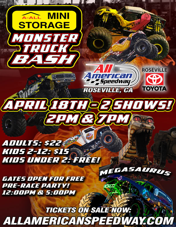 ROSEVILLE, Calif. (April 15, 2026) – Saturday April 18th is the return of the A-All Mini Storage Monster Truck Bash at All American Speedway with the most Monster Trucks to ever compete in Roseville. Six high-flying Monster Trucks soar above the track along with three ride along trucks in attendance plus the car crushing dinosaur Megasuarus. Saturday’s event features complete shows at 2pm and 7pm. Race fans are encouraged to come early for the free pre-race parties 2 hours before showtime. Monster Truck rides will be available for a fee.