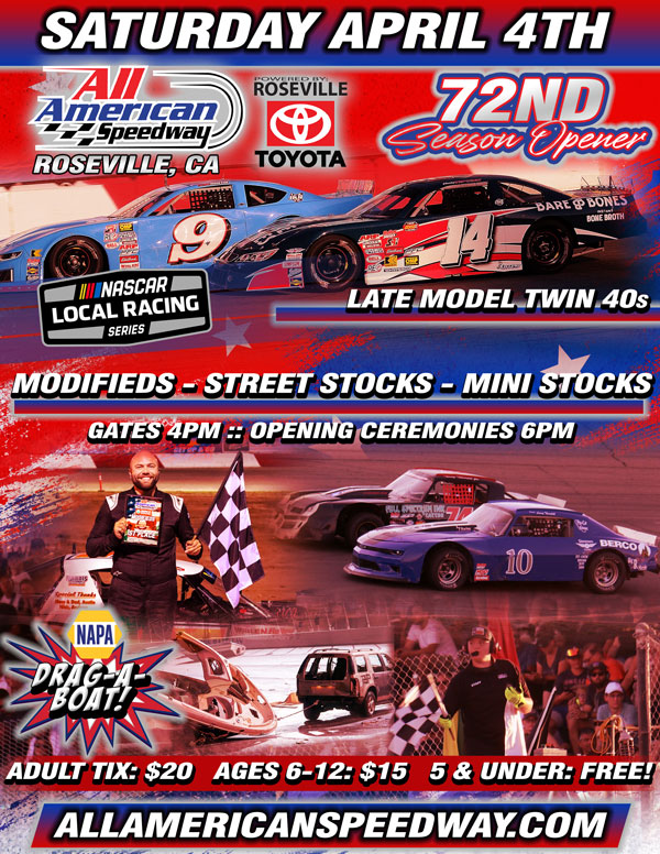 ROSEVILLE, Calif. (March 31, 2026) – The 72nd season of NASCAR racing at All American Speedway kicks off Saturday April 4th with a full slate of motorsports excitement plus the all-new NAPA Auto Parts Drag A Boat closing the show. NASCAR Berco Redwood Late Models launch their race to the national, regional, and state titles with twin 40-lap features. NASCAR Modifieds, Street Stocks and Mini Stocks will also be competing on the one-third mile speedway @the Grounds in Roseville. Photo by Top Dawg Photos